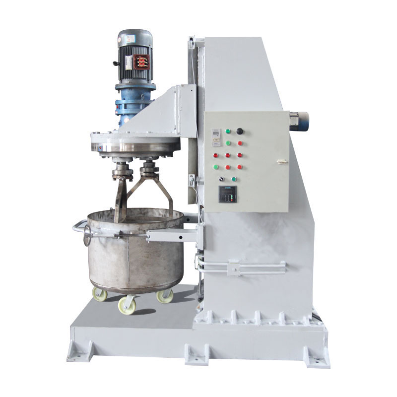 3、料筒:物料在不銹鋼材質(zhì)的料筒內(nèi)進(jìn)行攪拌。料筒裝在升降平臺(tái)上,通過油缸實(shí)現(xiàn)升降。料筒下部裝有滾輪,可以推進(jìn)。拉出。當(dāng)攪拌器旋轉(zhuǎn)時(shí),料筒由擺線針輪減速機(jī)通過凸輪和滾輪帶動(dòng)同時(shí)旋轉(zhuǎn),旋轉(zhuǎn)方向可以選擇。控制面板上裝有變頻調(diào)節(jié)旋鈕,可以根據(jù)工藝要求調(diào)節(jié)旋轉(zhuǎn)速度。